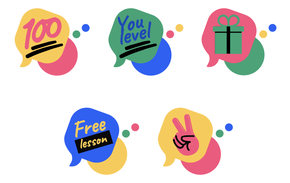 Иконка "сообщение" используется как символ языковой практики. 4 иконки разного цвета —